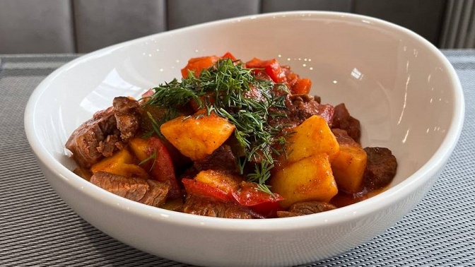 — азу по-татарски (традиционное блюдо татарской кухни, приготовленное из мяса говядины с тушеными овощами, с добавлением маринованных огурцов) — 320 г;