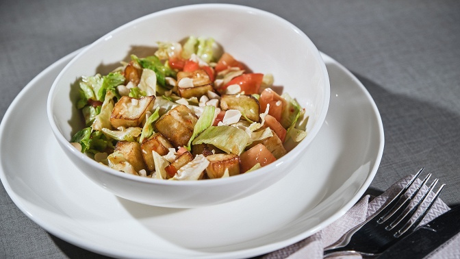 — салат с томатами и баклажанами (кубики баклажанов обжариваются до хрустящей корочки, подаются с томатами и свежей зеленью, заправляются сладким соусом «Чили» и соевым соусом, украшаются жареными орехами «Арахис») — 170 г;