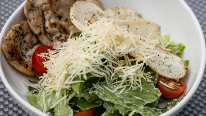 — салат «Цезарь» с нежным филе индейки (филе индейки обжаривается в прованских травах, листья «Айсберга» заправляются соусом «Цезарь», подается с томатами «Черри», слайсами багета и посыпается сыром «Пармезан») — 170 г;